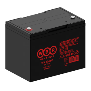 Аккумулятор WBR EVX12-75C - герметизированная, выполненная по технологии AGM, карбоновая свинцово-кислотная аккумуляторная батарея. Обладает высоким качеством и надежностью, устойчивы к глубоким разрядам и применяются для питания электрических транспортных средств, гольфкаров, газонокосилок, полотерных и поломоечных машин, медицинских колясок и другой техники.